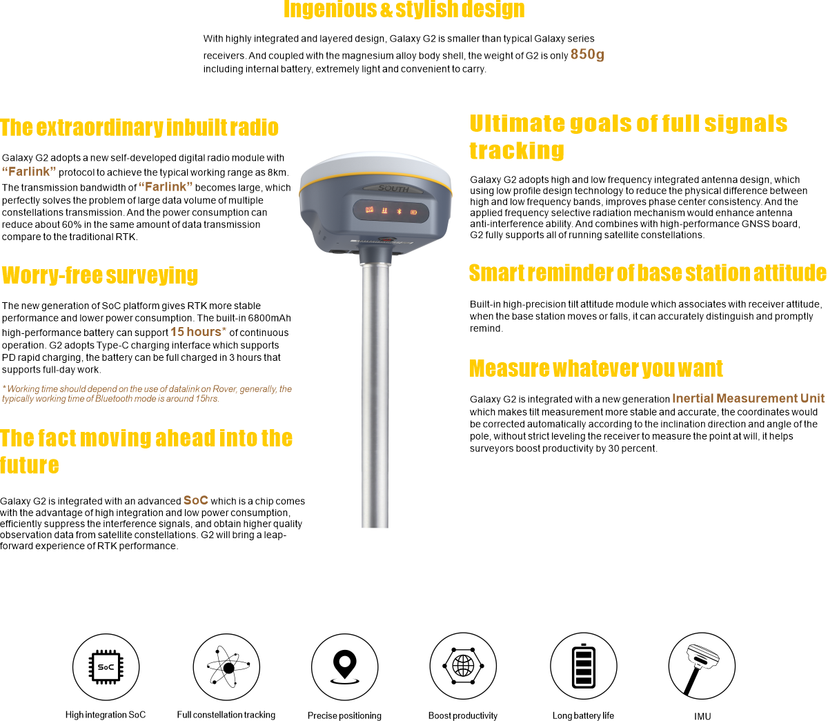 [1] Hardware is ready Items marked with * will be upgraded with the update of the firmware version The data comes from the SOUTH GNSS product laboratory, and the specific situation is subject to local actual usage. The measurement accuracy, precision and reliability are associated to various factors, including number of satellite tracking, observation time, multi-path, etc.