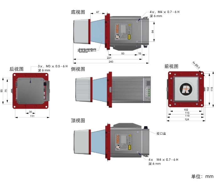 该激光雷达是 RIEGL VMY(集成了惯导和相机的车载测图系统)的核心部件。