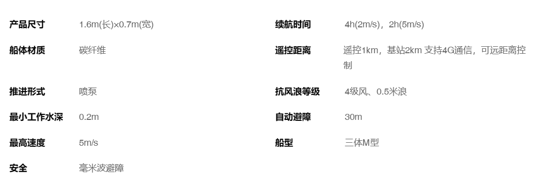 采用喷泵推进、防水草、防渔网缠绕 多种智能路径规划,支持智能自动化任务 碳纤维船体坚固耐用,环境适应性强